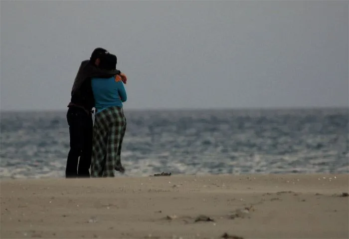 Dos jovenes enamorados en la playa al atardecer